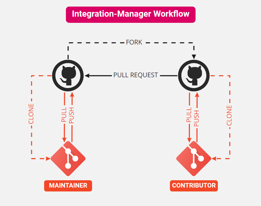 In the Integration-Manager Workflow, only some people (known as Maintainers) have push access to the central repository. In order to contribute to these projects, Contributors need to first fork the central repository. This creates a copy of the central repository on GitHub to which they have push access. Then they must clone this forked repository to get a local copy on their machines. Once they are done with their proposed changes, they push them into their forked copy of the centralized repository, and from it, send a pull request to the Maintainer of the original centralized repository. Maintainers then review the changes and decide whether they want to pull the changes into the repository or not.